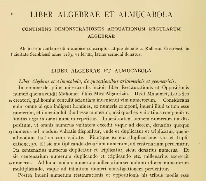 Het woord Al-gabr uit de titel van Khwarizmi’s boek werd algebra in de Europese talen, vooral omdat de Latijnse vertalingen de titel eigenlijk níet vertaalden: Zo zijn er vertalingen in omloop die het geschrift Ludus algebrae almucgrabalaeque (=”de kunst/kunde van algebra en mucgrabala”) noemen. Even terzijde: ik heb een vertaling met deze titel nergens gevonden, maar lees dit wel in elk résumé. Dus het zal wel. De meest gangbare Latijnse titel is echter Liber algebrae et almucabola, een vertaling gemaakt door Robert van Chester, een 12de eeuwse Engelsman die Arabisch heeft geleerd in Spanje. Hij maakte de vertaling in Segovia ca. 11452. Terzijde: De abt van Cluny (Petrus Venerabilis) had hem ook al gevraagd om ‘Al-Quran’ (de koran) te vertalen. Wat hij met hulp van een andere arabisten en een moslim ook heeft gedaan (1142/3). Daar lag echter zijn interesse niet. Die lag bij de wetenschappen (wiskunde, alchemie, en sterrekunde). De koranvertaling is trouwens in druk verschenen in Basel in 1543 op initiatief van de Theodor Buchmann (Bibliander), met een voorwoord van Martin Luther, “Machumetis Saracenorum principis…. Alcoran“3.