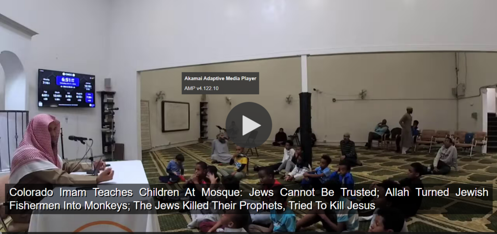 Een Amerikaanse imam (Colorado1[Umar Mitchell, imam van Masjid Umar Ibn Al-Khattab in Aurora. De setting is in het Colorado Muslim Community Centre. De les werd gelivestreamd./note]) geeft les aan kinderen over “de Joden”. Datum 25 oktober 2023. Alle klassieke thema’s komen aan bod: Joden zijn onbetrouwbaar, ze verbreken het verbond, contracten. Je moet er geen handel mee drijven. Allah veranderde Joodse vissers die de sabbath omzeilden in apen (wordt vrij verteld verwijzend naar de koran – soera Baqara, en nadrukkelijk letterlijk geïnterpreteerd). Joden vermoordden hun profeten en probeerden Jezus om te brengen. Ze zijn niet allemaal slecht, er zijn een paar uitzonderingen.